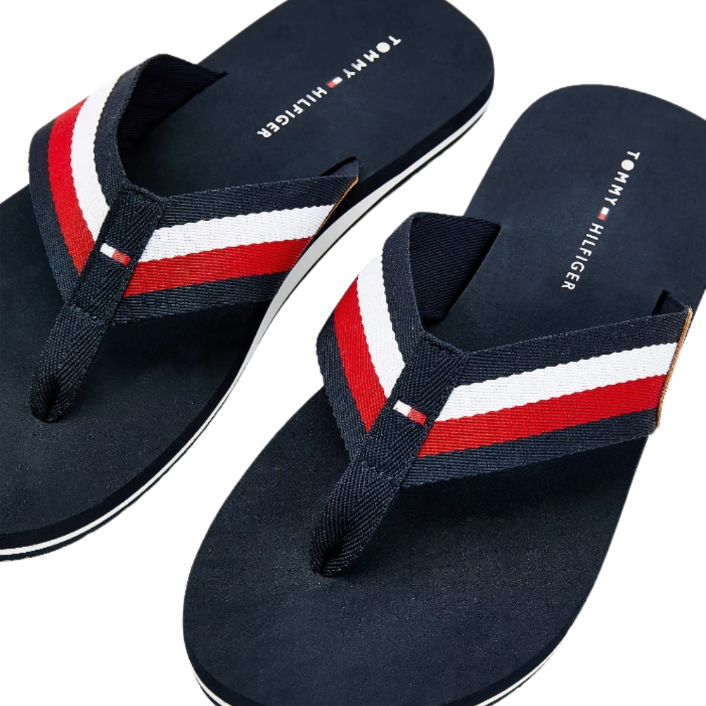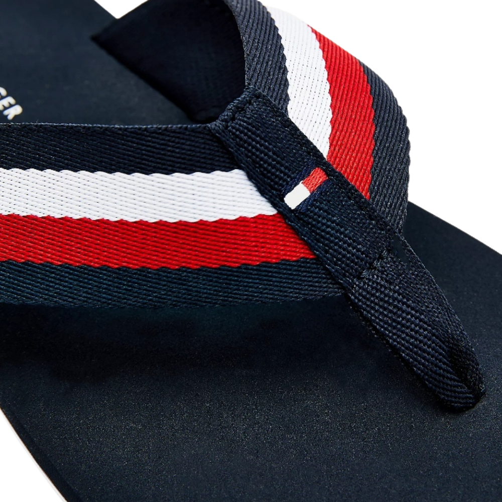 Elegantes chanclas de estilo casual con tiras de cinta distintivas y detalle de parche con el logo de Tommy Hilfiger en relieve.
